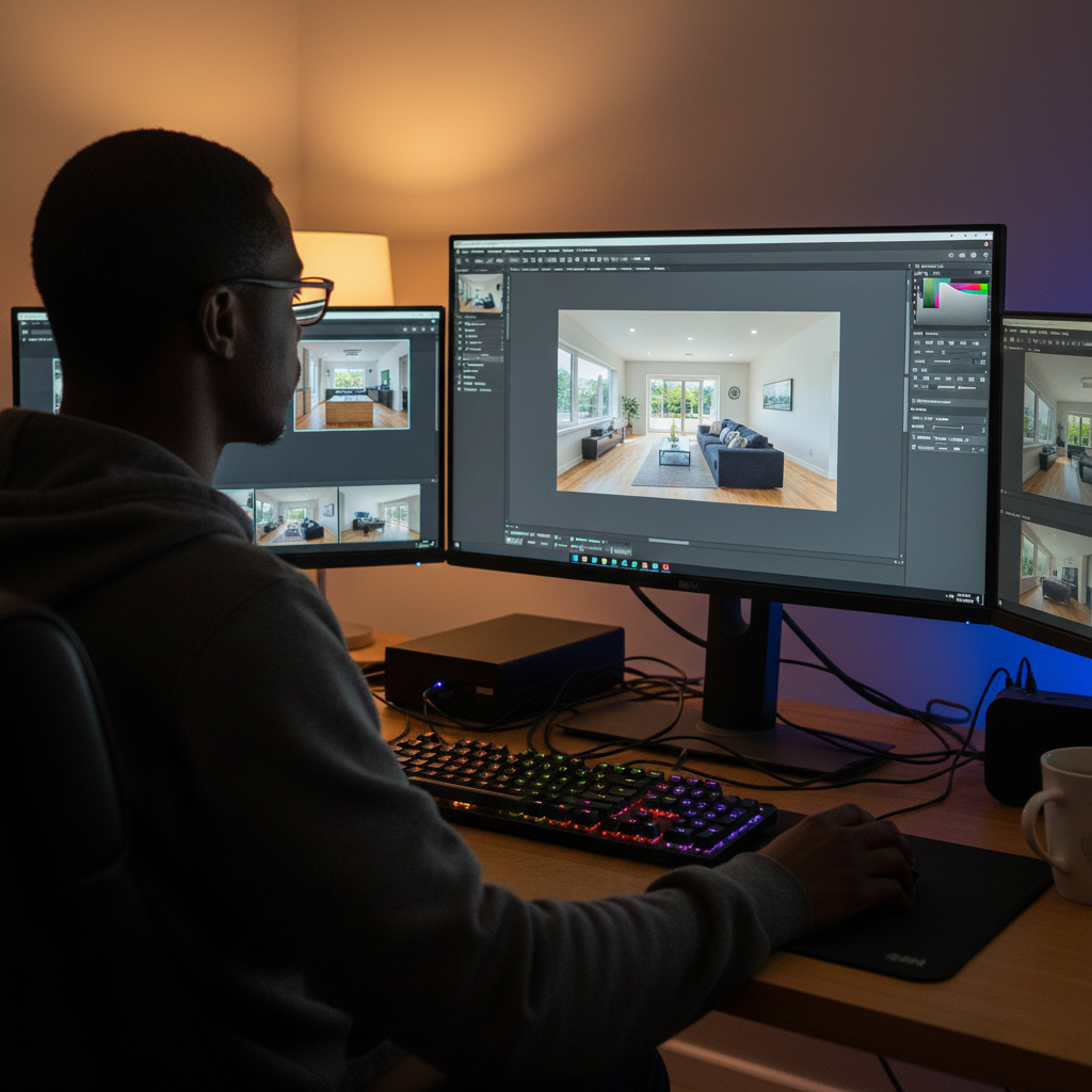Upload cell-phone or DSLR photos for high-quality color correction, sky replacement, window pulls, TV screens, and more.